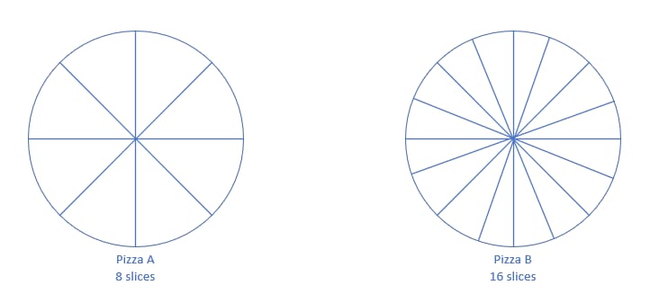 The picture above shows two pizzas, Pizza A and Pizza B. Both are the same size, but Pizza A has 8 slices, while Pizza B has 16 slices. Pizza A can be shared among 8 people, and Pizza B can serve 16 people, though with slightly smaller portions. Which would you prefer: Pizza A or Pizza B?